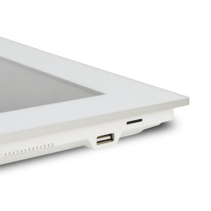 Кольоровий домофон з TFT сенсорним екраном 7 дюймів і сенсорними кнопками, підключення 2 панелей виклику AHD/TVI/CVI, 2 відеокамер AHD/TVI/CVI, 1 додаткового монітора (телевізора). Розмова по гучному зв'язку, є інтерком на 3 відеодомофони. З'єднання з панеллю виклику 4-дротове. Слот microSD до 64 Гб, живлення 100-240V, споживання 7Вт, в режимі очікування 3Вт. Корпус білого кольору. Лицьова панель із загартованого скла, що актуально для теперішнього часу для обробки спиртовмісними антисептиками. Розміри 197x127x20мм.