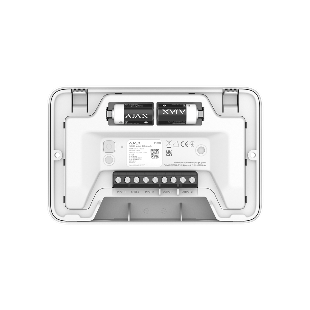 Ajax EN54 I/O Module (2X2) Jeweller white — бездротовий адресний модуль з двома входами і двома релейними виходами для інтеграції сторонніх дротових пристроїв в систему Ajax. Він працює за захищеним радіопротоколом Jeweller з дальністю зв’язку до 1700 м, підтримує підключення за схемами NO, NC, EOL, 2EOL і 3EOL, а також оснащений функціями захисту від саботажу і контролю стану ліній. Виходи модуля підтримують роботу в бістабільному та імпульсному режимах, з навантаженням до 10 А при змінному струмі і до 5 А при постійному. Живлення забезпечують дві попередньо встановлені батареї CR123A, термін служби яких досягає п’яти років. Пристрій відповідає вимогам стандарту EN 54 і розрахований на експлуатацію всередині приміщень.