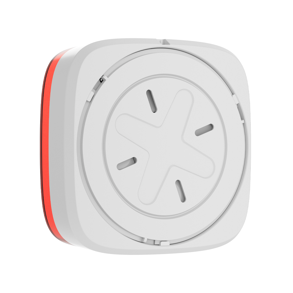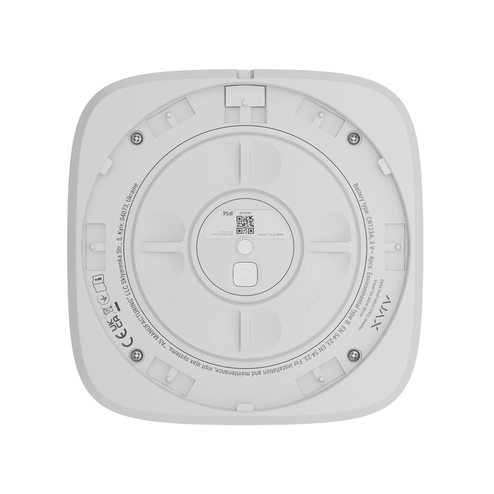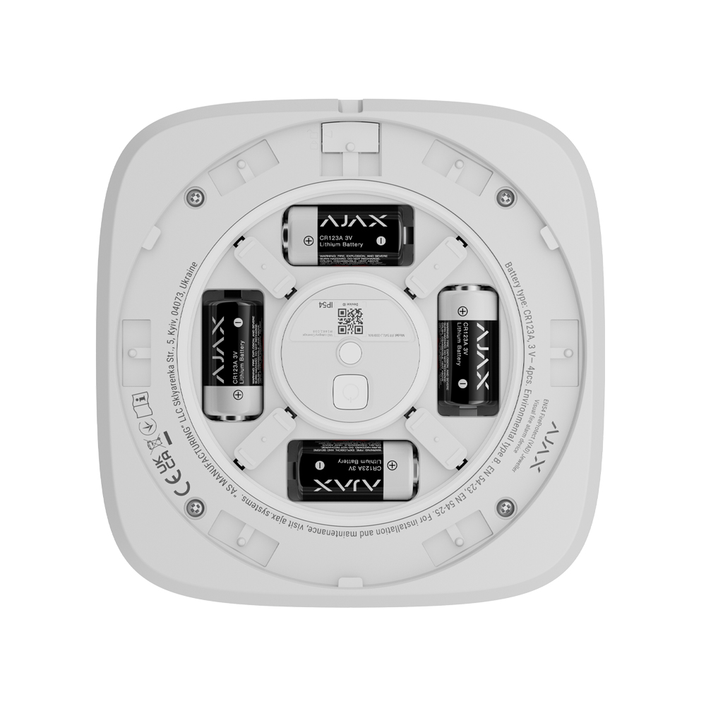 Конструкція оснащена системою захисту від саботажу: вбудований тампер реагує на демонтаж, а замок SmartBracket запобігає несанкціонованому зняттю. Живлення забезпечують чотири літієві батареї CR123A, які входять в комплект і дозволяють пристрою працювати до п’яти років. При необхідності заміна батарей виконується без інструментів, а захист від зворотної полярності запобігає помилкам при установці. Доступні колірні варіанти дозволяють використовувати оповіщувач в різних інтер’єрах і умовах експлуатації