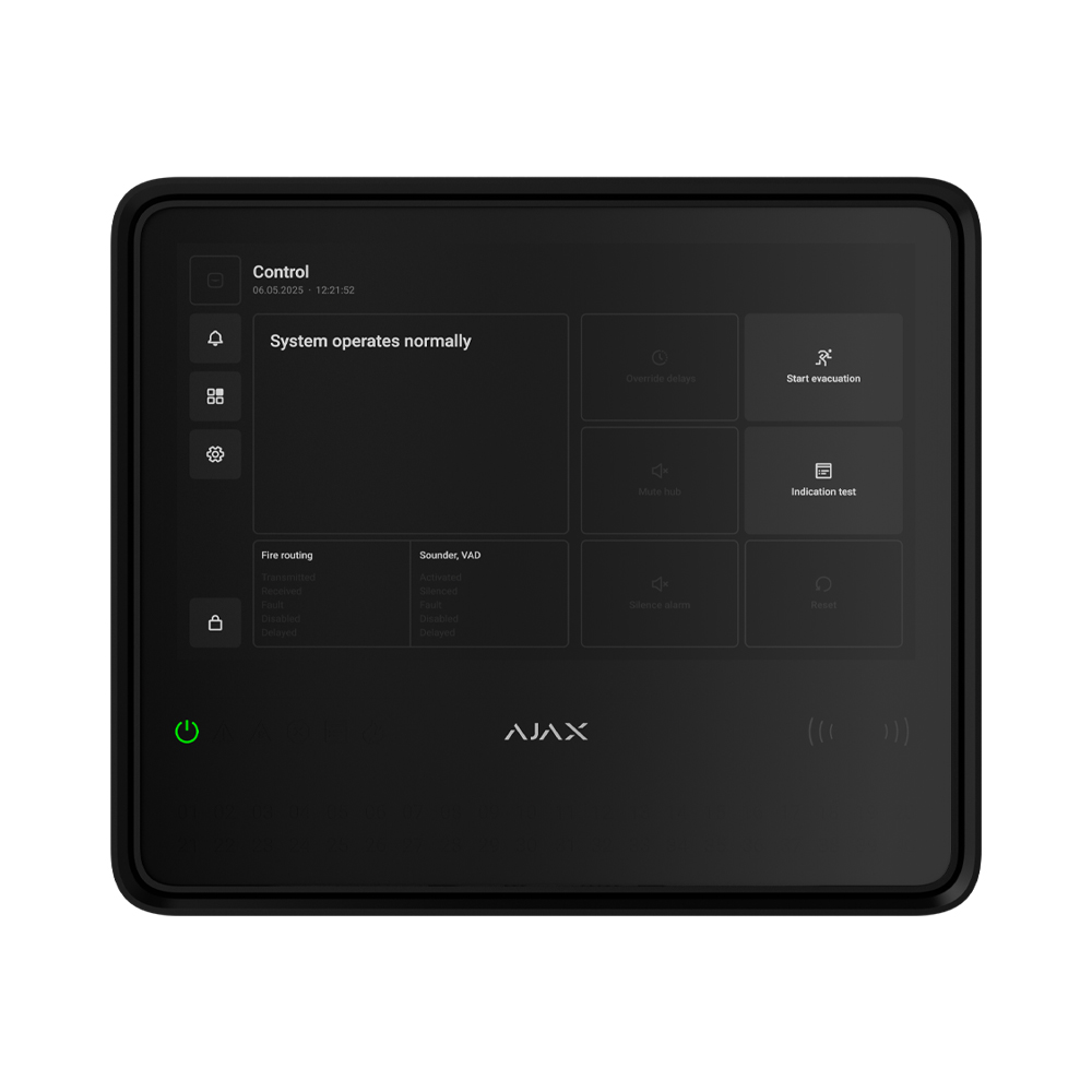 Пристрій оснащений сенсорним IPS-дисплеєм діагоналлю 10,1″ з роздільною здатністю 1024×600 точок, що забезпечує відображення поточного стану системи й журналу подій. ППКП підтримує авторизацію користувачів за допомогою кодів і персональних ключів, зберігає до 5000 подій у внутрішній пам’яті та дозволяє здійснювати управління з дисплея або через мобільні та десктопні додатки Ajax.