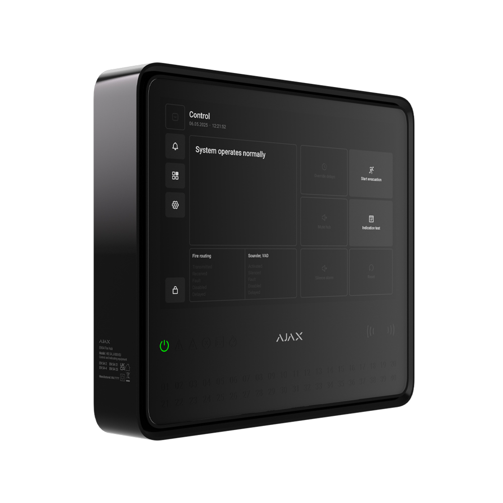 Бездротовий ППКП Ajax EN54 Fire Hub Jeweller black — це центральний блок пожежної сигналізації з підтримкою до 200 пристроїв і 40 пожежних зон. Пристрій оснащений сенсорним IPS-дисплеєм 10,1″, зберігає до 5000 подій і забезпечує фото-верифікацію тривог. Для зв’язку використовуються технології Jeweller і Wings з дальністю до 1800 м і шифруванням даних, а також Ethernet, Wi-Fi та два слоти для SIM-карт (2G/3G/4G LTE). Живлення забезпечується від мережі 110–240 В з можливістю підключення акумулятора на 5 або 10 А·год, що дозволяє системі працювати автономно до 72 годин (не входить в комплект)