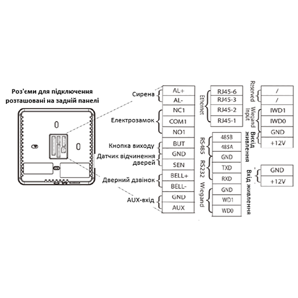 Інтерфейси підключення: електрозамок, дверний датчик, тривожный вихід, кнопка виходу, дзвінок