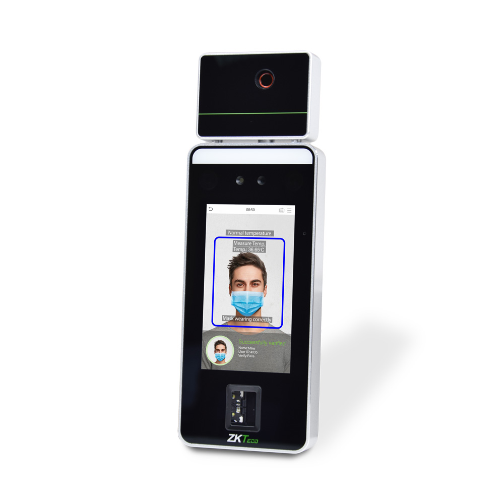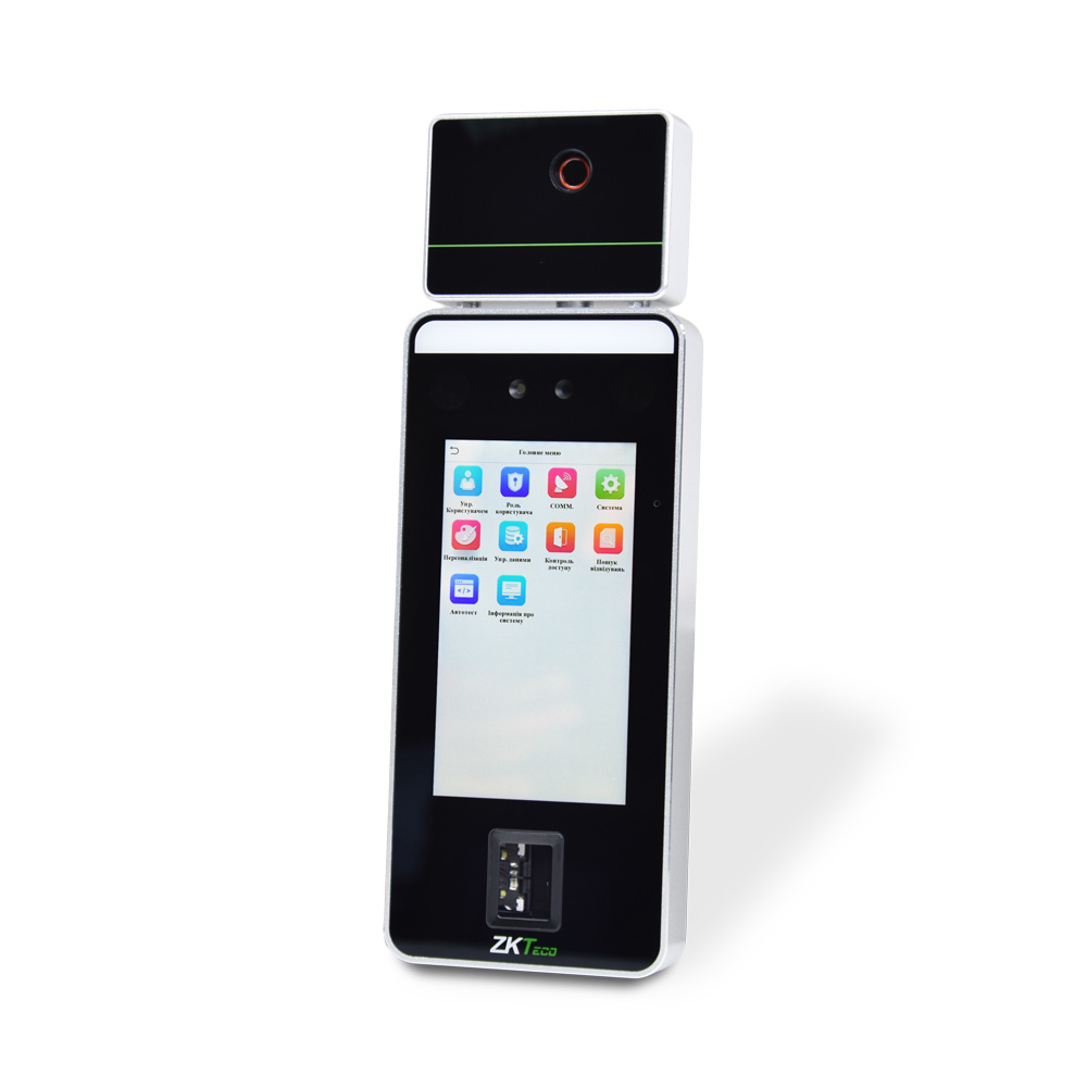 SpeedFace-V5L (TI) (FP) (MF) – термінал з тепловізорною камерою, що відображає зображення на екрані, і спеціалізованим процесором ZKTeco для розпізнавання облич і новітньої технології комп’ютерного зору. Підтримує розпізнавання облич, долонь і відбитків пальців.
