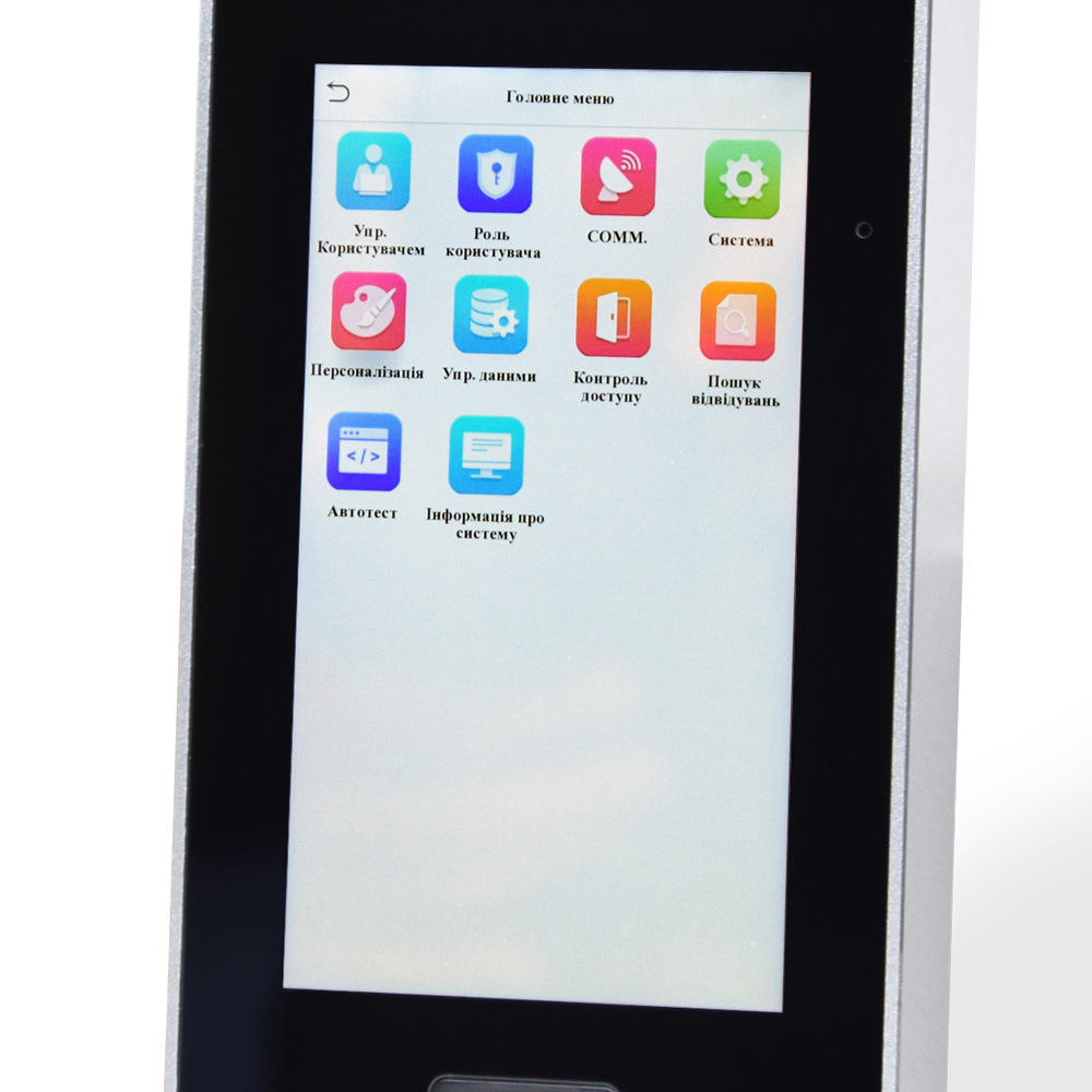 Дисплей: TFT 5″ сенсорний. Пам’ять шаблонів облич: 6 000. Пам’ять шаблонів долоней: 3 000. Пам’ять шаблонів відбитків пальців: 6 000. Журнал подій: 200 000. Операційна система: Linux. Зв’язок: TCP/IP, Wiegand Вхід / вихід, RS485. Працює з картками Mifare