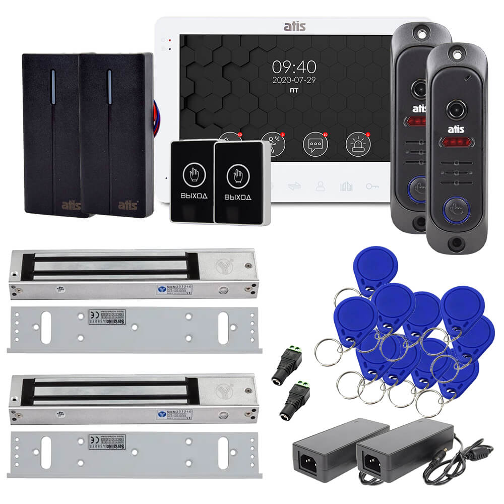 Комплект «ATIS Консьєрж 2» – відеодомофон 7″ з відеопанелями, контролери-зчитувачі, електромагнітні замки для організації контролю доступу для двох точок проходу по брелоках EM-Marine