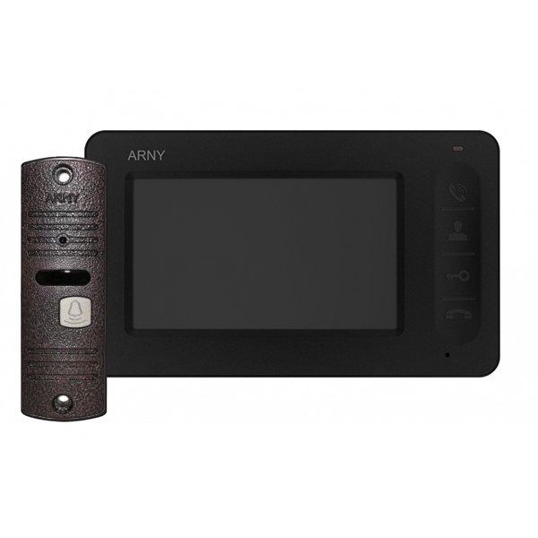 Комплект відеодомофону Arny AVD-4005 (чорний/мідний) складається з кольорового відеодомофону AVD-405 діагональ екрану 4.3″ із сенсорними кнопками управління чорного кольору та кольорової панелі виклику AVP-05 мідного кольору