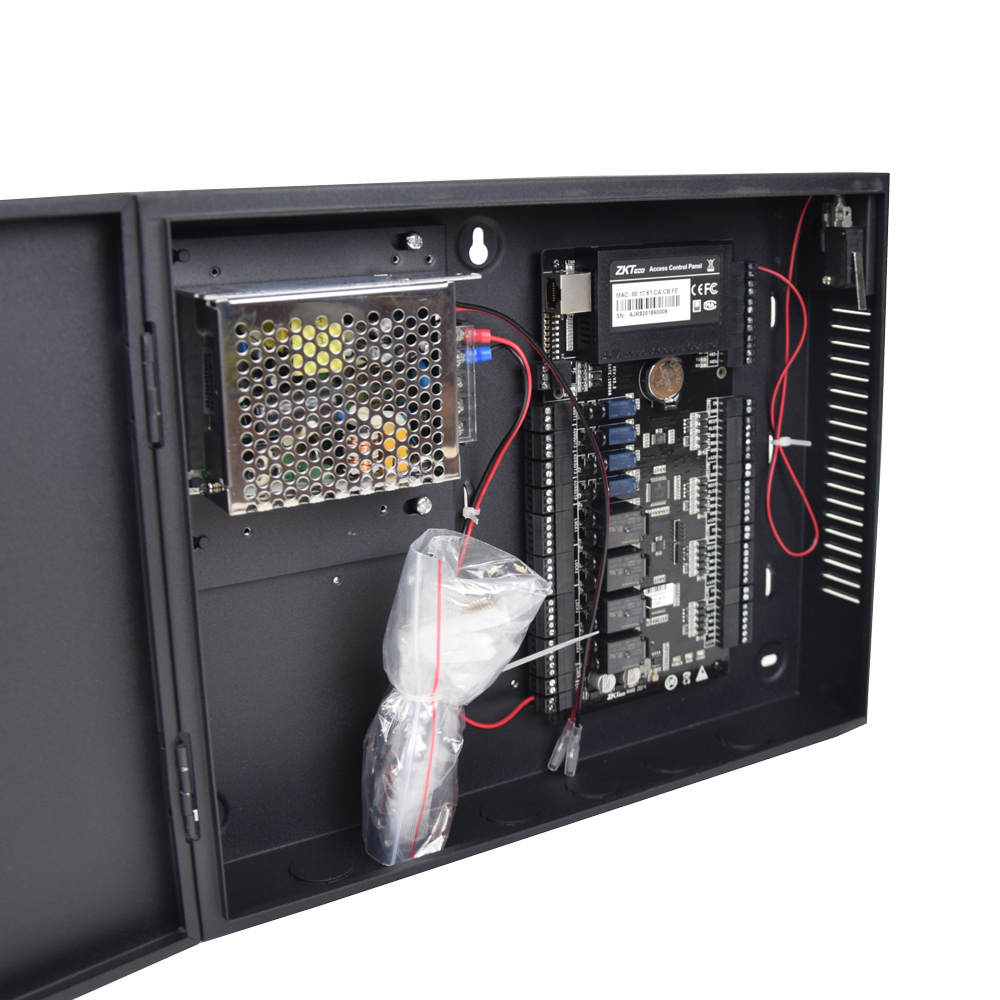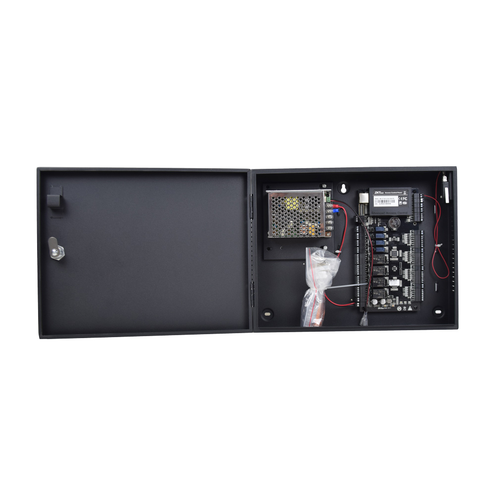 Мережевий контролер на 4 двері, у боксі. Пам’ять 30 000 RFID карт, 100 000 записів журналу подій. 4 зчитувача, входи: 4 кнопки, 4 геркони, 4 AUX, виходи: 4 реле для замка, 4 доп. реле для AUX виходу. Інтерфейси – RS485, Ethernet. Можливо підключення акумулятора 7Аг. Розміри плати 218х106 мм, боксу 380х80х280 мм.