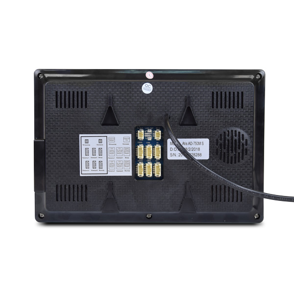 Кольоровий домофон з TFT сенсорним екраном 7 дюймів, підключення 2 панелей виклику, 2 відеокамер, 2 датчиків тривоги і 1 додаткового монітора (телевізора). Розмова по гучному зв’язку, є інтерком на 3 відеодомофона. З’єднання з панеллю виклику 4-провідне. Слот microSD до 32 Гб, джерело живлення 100-240V, споживання 600mA, в режимі очікування 250mA. Корпус чорного кольору. Розміри 225x150x20мм.