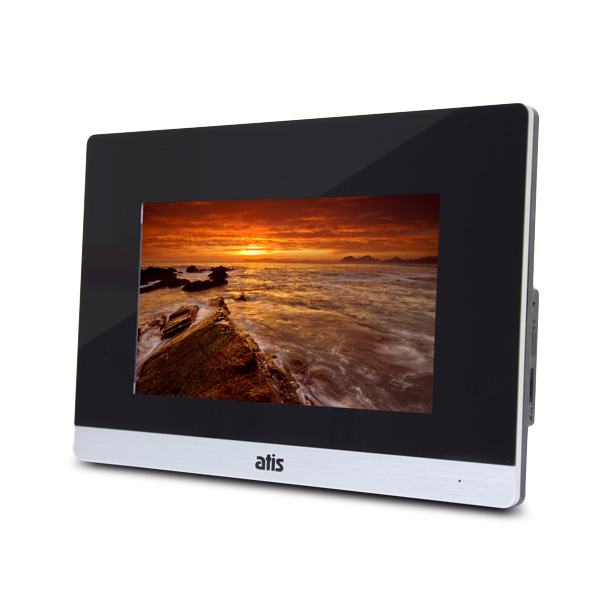 Відеодомофон ATIS AD-750M S-Black з кольоровим 7 дюймовим TFT-екраном, можливістю підключення 2 панелей виклику, 2 аналогових відеокамер, 2 датчиків тривоги, 3 відеодомофонів і 1 додаткового монітора (телевізора). Колір – чорний.