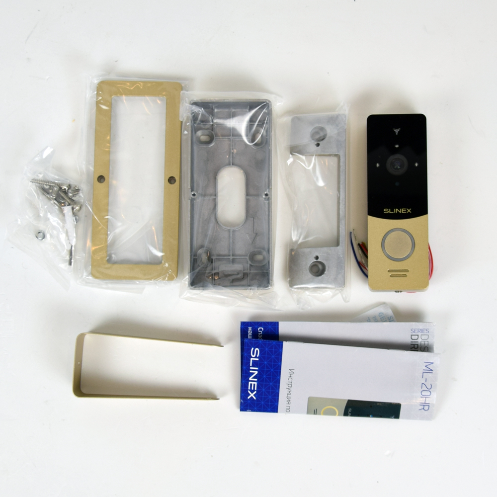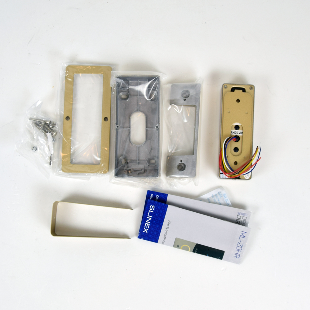 Корпус відеопанелі Slinex ML-20HR виконаний із металу із пластиковими вставками. Клас захисту IP65 (система класифікації ступеня захисту оболонки електроустаткування), що означає надійний захист внутрішніх компонентів від потрапляння пилу та стійкість до перепадів температур (-40°C ~ +50°C). Колір корпусу золото із чорним.